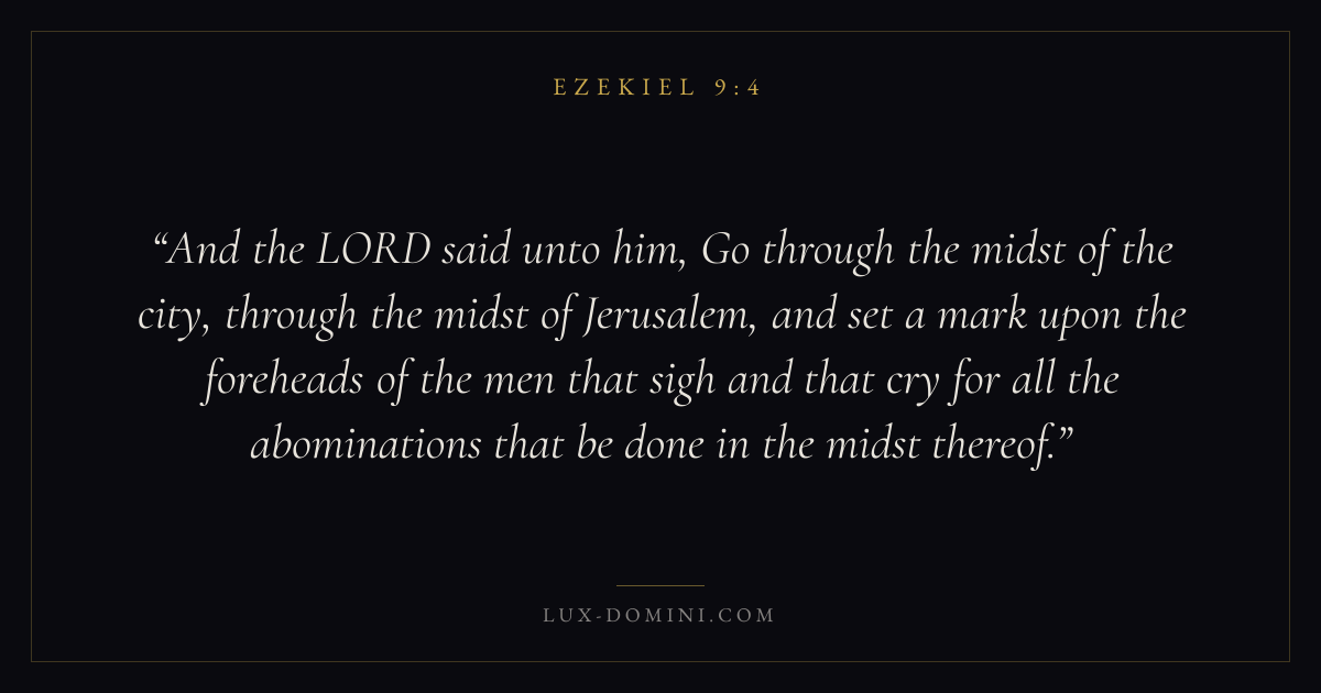 And the LORD said unto him, Go through the midst of the city, through the midst of Jerusalem, and set a mark upon the foreheads of the men that sigh and that cry for all the abominations that be done in the midst thereof.