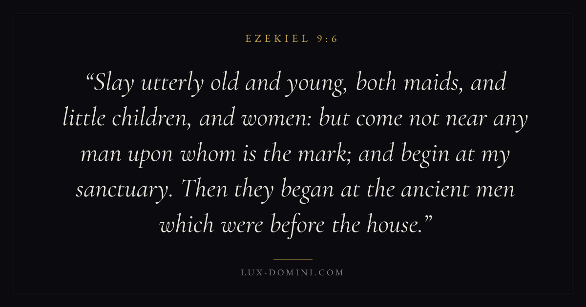 Slay utterly old and young, both maids, and little children, and women: but come not near any man upon whom is the mark; and begin at my sanctuary. Then they began at the ancient men which were before the house.