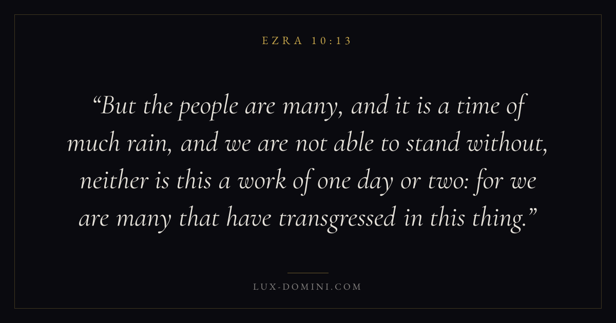 But the people are many, and it is a time of much rain, and we are not able to stand without, neither is this a work of one day or two: for we are many that have transgressed in this thing.