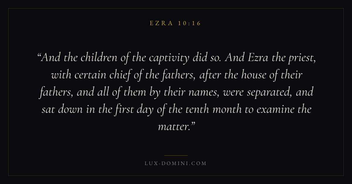 And the children of the captivity did so. And Ezra the priest, with certain chief of the fathers, after the house of their fathers, and all of them by their names, were separated, and sat down in the first day of the tenth month to examine the matter.