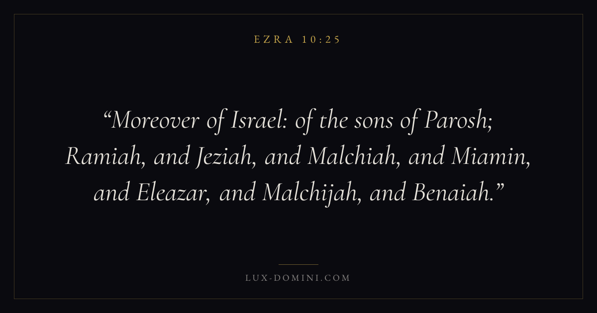 Moreover of Israel: of the sons of Parosh; Ramiah, and Jeziah, and Malchiah, and Miamin, and Eleazar, and Malchijah, and Benaiah.