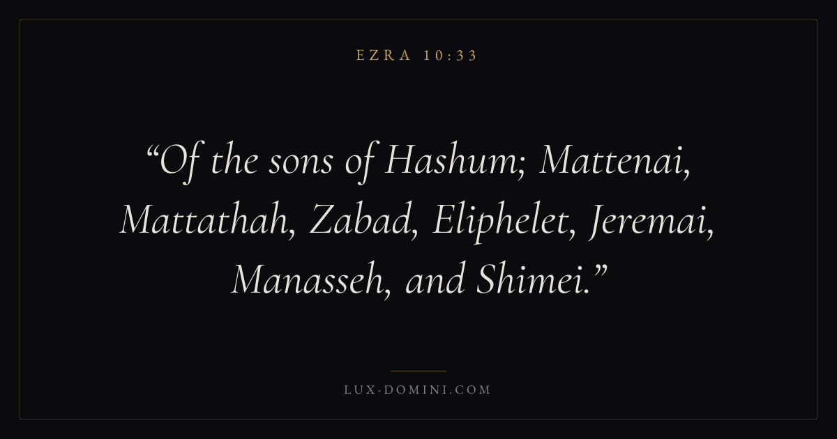 Of the sons of Hashum; Mattenai, Mattathah, Zabad, Eliphelet, Jeremai, Manasseh, and Shimei.