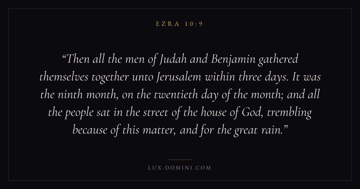 Then all the men of Judah and Benjamin gathered themselves together unto Jerusalem within three days. It was the ninth month, on the twentieth day of the month; and all the people sat in the street of the house of God, trembling because of this matter, and for the great rain.