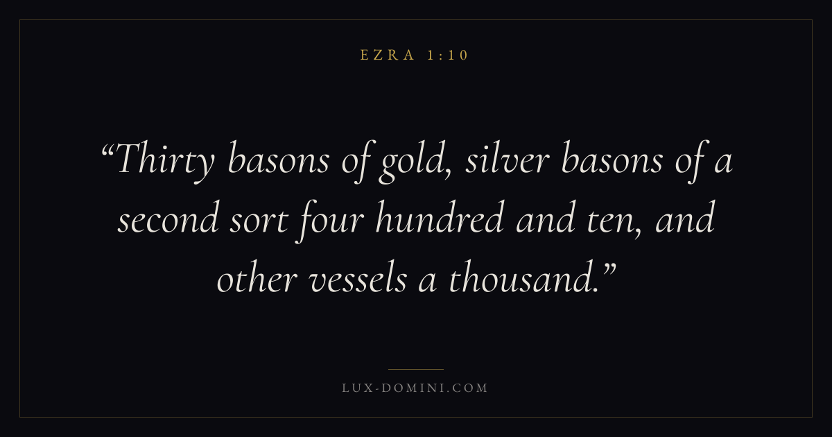 Thirty basons of gold, silver basons of a second sort four hundred and ten, and other vessels a thousand.