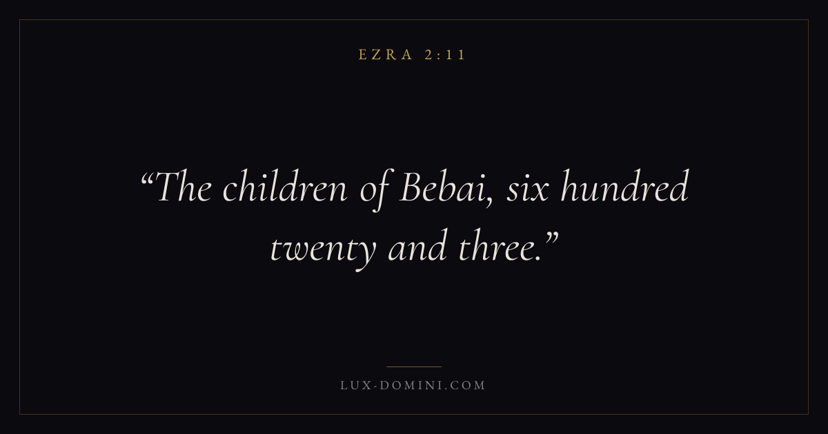Books / Ezra / Chapter 2 / Verse 11 ← Ezra 2:10 Ezra 2:11 Ezra 2:12 → The children of Bebai, six hundred twenty and three. Download verse card Share on Twitter Share on Facebook Pin it ✦ Key themes ReturnTempleTorahRepentance Read with Ezra 2:10 Related topics Bible verses about repentance ✦ Ezra Chapter 2 verses V. 1 V. 2 V. 3 V. 4 V. 5 V. 6 V. 7 V. 8 V. 9 V. 10 V. 11 V. 12 V. 13 V. 14 V. 15 V. 16 V. 17 V. 18 V. 19 V. 20 V. 21 V. 22 V. 23 V. 24 V. 25 V. 26 V. 27 V. 28 V. 29 V. 30 V. 31 V. 32 V. 33 V. 34 V. 35 V. 36 V. 37 V. 38 V. 39 V. 40 V. 41 V. 42 V. 43 V. 44 V. 45 V. 46 V. 47 V. 48 V. 49 V. 50 V. 51 V. 52 V. 53 V. 54 V. 55 V. 56 V. 57 V. 58 V. 59 V. 60 V. 61 V. 62 V. 63 V. 64 V. 65 V. 66 V. 67 V. 68 V. 69 V. 70