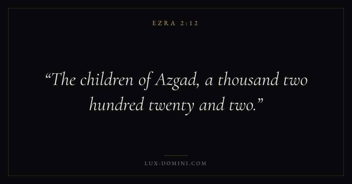 Books / Ezra / Chapter 2 / Verse 12 ← Ezra 2:11 Ezra 2:12 Ezra 2:13 → The children of Azgad, a thousand two hundred twenty and two. Download verse card Share on Twitter Share on Facebook Pin it ✦ Key themes ReturnTempleTorahRepentance Read with Ezra 2:13 Related topics Bible verses about repentance ✦ Ezra Chapter 2 verses V. 1 V. 2 V. 3 V. 4 V. 5 V. 6 V. 7 V. 8 V. 9 V. 10 V. 11 V. 12 V. 13 V. 14 V. 15 V. 16 V. 17 V. 18 V. 19 V. 20 V. 21 V. 22 V. 23 V. 24 V. 25 V. 26 V. 27 V. 28 V. 29 V. 30 V. 31 V. 32 V. 33 V. 34 V. 35 V. 36 V. 37 V. 38 V. 39 V. 40 V. 41 V. 42 V. 43 V. 44 V. 45 V. 46 V. 47 V. 48 V. 49 V. 50 V. 51 V. 52 V. 53 V. 54 V. 55 V. 56 V. 57 V. 58 V. 59 V. 60 V. 61 V. 62 V. 63 V. 64 V. 65 V. 66 V. 67 V. 68 V. 69 V. 70