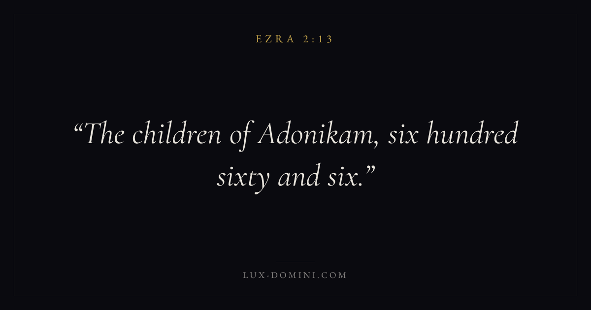 Books / Ezra / Chapter 2 / Verse 13 ← Ezra 2:12 Ezra 2:13 Ezra 2:14 → The children of Adonikam, six hundred sixty and six. Download verse card Share on Twitter Share on Facebook Pin it ✦ Key themes ReturnTempleTorahRepentance Read with Ezra 2:12 Related topics Bible verses about repentance ✦ Ezra Chapter 2 verses V. 1 V. 2 V. 3 V. 4 V. 5 V. 6 V. 7 V. 8 V. 9 V. 10 V. 11 V. 12 V. 13 V. 14 V. 15 V. 16 V. 17 V. 18 V. 19 V. 20 V. 21 V. 22 V. 23 V. 24 V. 25 V. 26 V. 27 V. 28 V. 29 V. 30 V. 31 V. 32 V. 33 V. 34 V. 35 V. 36 V. 37 V. 38 V. 39 V. 40 V. 41 V. 42 V. 43 V. 44 V. 45 V. 46 V. 47 V. 48 V. 49 V. 50 V. 51 V. 52 V. 53 V. 54 V. 55 V. 56 V. 57 V. 58 V. 59 V. 60 V. 61 V. 62 V. 63 V. 64 V. 65 V. 66 V. 67 V. 68 V. 69 V. 70