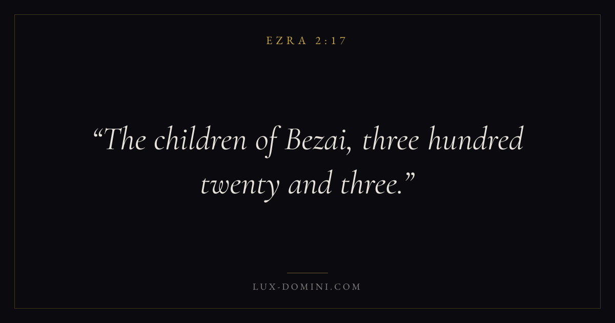 Books / Ezra / Chapter 2 / Verse 17 ← Ezra 2:16 Ezra 2:17 Ezra 2:18 → The children of Bezai, three hundred twenty and three. Download verse card Share on Twitter Share on Facebook Pin it ✦ Key themes ReturnTempleTorahRepentance Read with Ezra 2:16 Related topics Bible verses about repentance ✦ Ezra Chapter 2 verses V. 1 V. 2 V. 3 V. 4 V. 5 V. 6 V. 7 V. 8 V. 9 V. 10 V. 11 V. 12 V. 13 V. 14 V. 15 V. 16 V. 17 V. 18 V. 19 V. 20 V. 21 V. 22 V. 23 V. 24 V. 25 V. 26 V. 27 V. 28 V. 29 V. 30 V. 31 V. 32 V. 33 V. 34 V. 35 V. 36 V. 37 V. 38 V. 39 V. 40 V. 41 V. 42 V. 43 V. 44 V. 45 V. 46 V. 47 V. 48 V. 49 V. 50 V. 51 V. 52 V. 53 V. 54 V. 55 V. 56 V. 57 V. 58 V. 59 V. 60 V. 61 V. 62 V. 63 V. 64 V. 65 V. 66 V. 67 V. 68 V. 69 V. 70