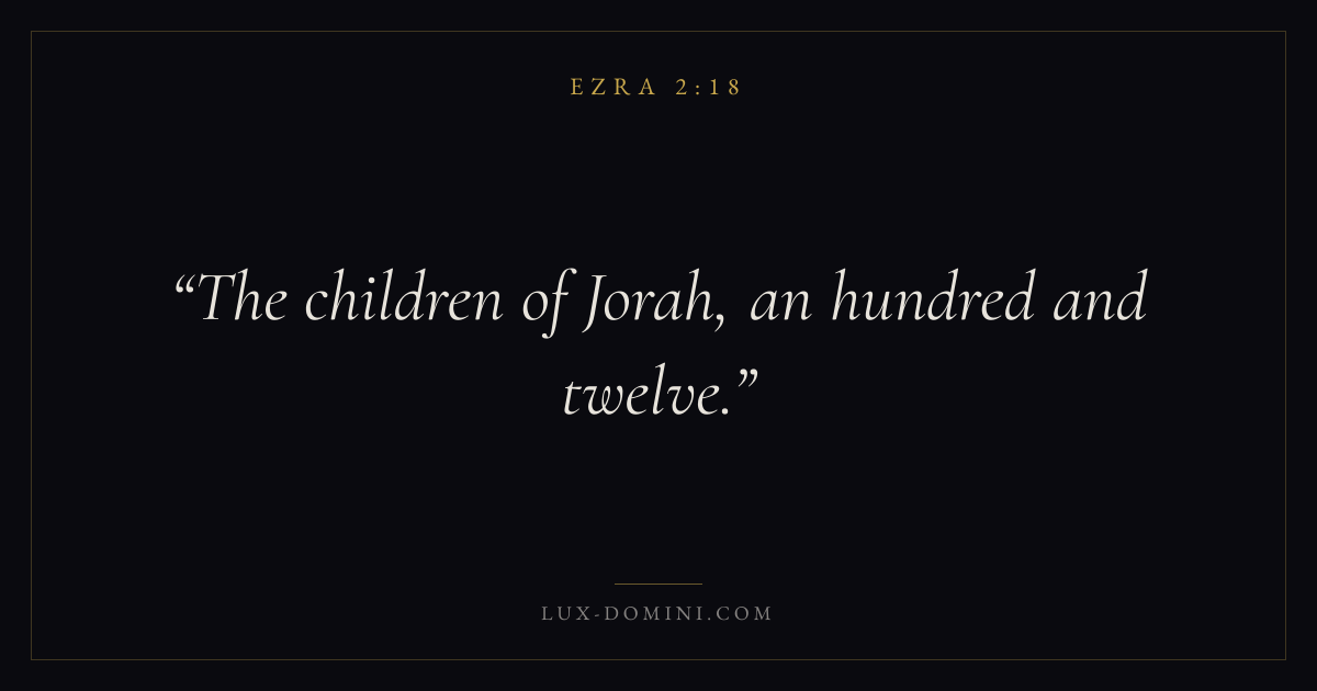 Books / Ezra / Chapter 2 / Verse 18 ← Ezra 2:17 Ezra 2:18 Ezra 2:19 → The children of Jorah, an hundred and twelve. Download verse card Share on Twitter Share on Facebook Pin it ✦ Key themes ReturnTempleTorahRepentance Read with Ezra 2:19 Related topics Bible verses about repentance ✦ Ezra Chapter 2 verses V. 1 V. 2 V. 3 V. 4 V. 5 V. 6 V. 7 V. 8 V. 9 V. 10 V. 11 V. 12 V. 13 V. 14 V. 15 V. 16 V. 17 V. 18 V. 19 V. 20 V. 21 V. 22 V. 23 V. 24 V. 25 V. 26 V. 27 V. 28 V. 29 V. 30 V. 31 V. 32 V. 33 V. 34 V. 35 V. 36 V. 37 V. 38 V. 39 V. 40 V. 41 V. 42 V. 43 V. 44 V. 45 V. 46 V. 47 V. 48 V. 49 V. 50 V. 51 V. 52 V. 53 V. 54 V. 55 V. 56 V. 57 V. 58 V. 59 V. 60 V. 61 V. 62 V. 63 V. 64 V. 65 V. 66 V. 67 V. 68 V. 69 V. 70