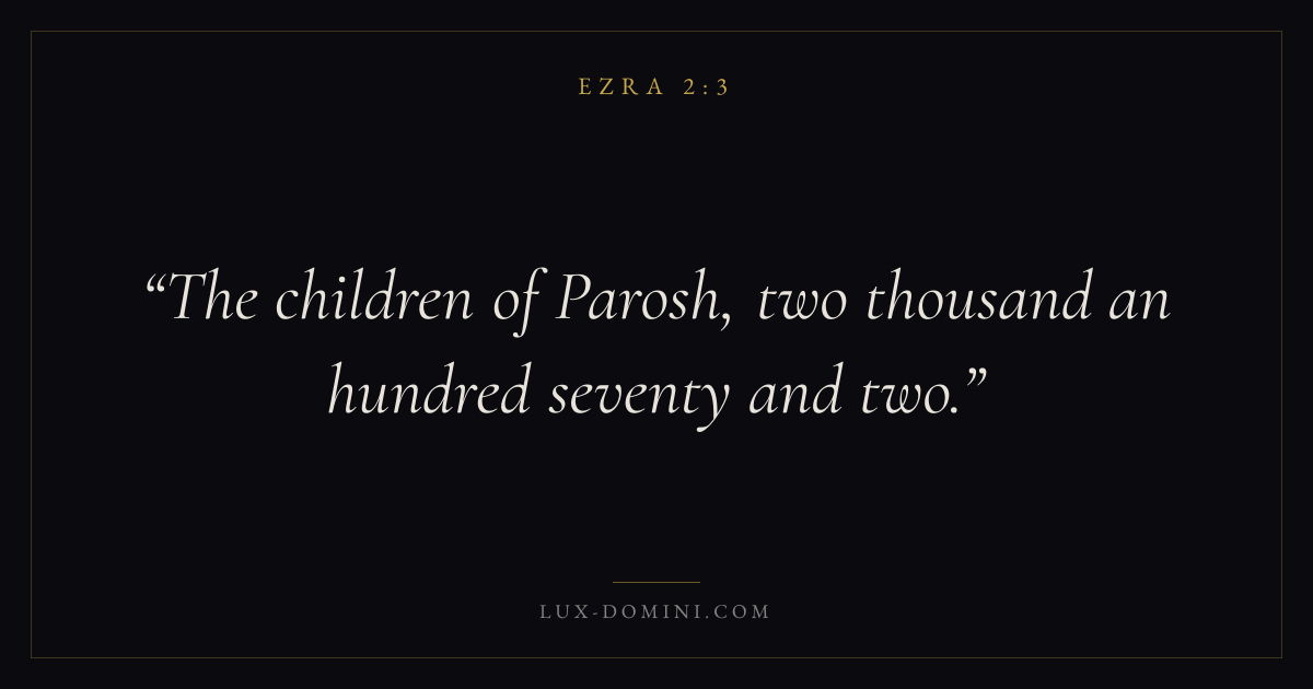 Books / Ezra / Chapter 2 / Verse 3 ← Ezra 2:2 Ezra 2:3 Ezra 2:4 → The children of Parosh, two thousand an hundred seventy and two. Download verse card Share on Twitter Share on Facebook Pin it ✦ Key themes ReturnTempleTorahRepentance Read with Ezra 2:1Ezra 2:2 Related topics Bible verses about repentance ✦ Ezra Chapter 2 verses V. 1 V. 2 V. 3 V. 4 V. 5 V. 6 V. 7 V. 8 V. 9 V. 10 V. 11 V. 12 V. 13 V. 14 V. 15 V. 16 V. 17 V. 18 V. 19 V. 20 V. 21 V. 22 V. 23 V. 24 V. 25 V. 26 V. 27 V. 28 V. 29 V. 30 V. 31 V. 32 V. 33 V. 34 V. 35 V. 36 V. 37 V. 38 V. 39 V. 40 V. 41 V. 42 V. 43 V. 44 V. 45 V. 46 V. 47 V. 48 V. 49 V. 50 V. 51 V. 52 V. 53 V. 54 V. 55 V. 56 V. 57 V. 58 V. 59 V. 60 V. 61 V. 62 V. 63 V. 64 V. 65 V. 66 V. 67 V. 68 V. 69 V. 70