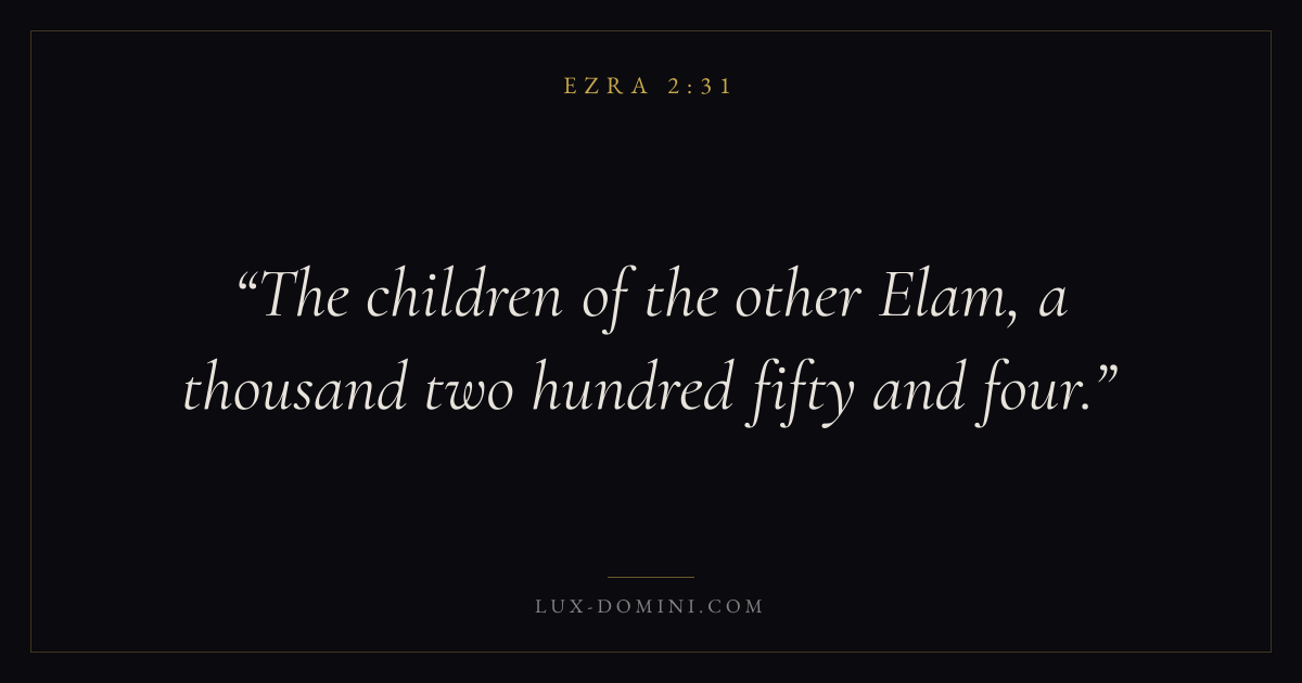 Books / Ezra / Chapter 2 / Verse 31 ← Ezra 2:30 Ezra 2:31 Ezra 2:32 → The children of the other Elam, a thousand two hundred fifty and four. Download verse card Share on Twitter Share on Facebook Pin it ✦ Key themes ReturnTempleTorahRepentance Read with Ezra 2:30 Related topics Bible verses about repentance ✦ Ezra Chapter 2 verses V. 1 V. 2 V. 3 V. 4 V. 5 V. 6 V. 7 V. 8 V. 9 V. 10 V. 11 V. 12 V. 13 V. 14 V. 15 V. 16 V. 17 V. 18 V. 19 V. 20 V. 21 V. 22 V. 23 V. 24 V. 25 V. 26 V. 27 V. 28 V. 29 V. 30 V. 31 V. 32 V. 33 V. 34 V. 35 V. 36 V. 37 V. 38 V. 39 V. 40 V. 41 V. 42 V. 43 V. 44 V. 45 V. 46 V. 47 V. 48 V. 49 V. 50 V. 51 V. 52 V. 53 V. 54 V. 55 V. 56 V. 57 V. 58 V. 59 V. 60 V. 61 V. 62 V. 63 V. 64 V. 65 V. 66 V. 67 V. 68 V. 69 V. 70