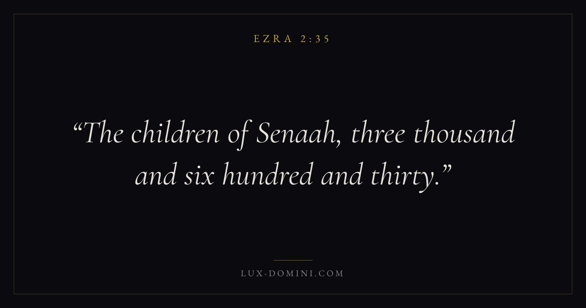 Books / Ezra / Chapter 2 / Verse 35 ← Ezra 2:34 Ezra 2:35 Ezra 2:36 → The children of Senaah, three thousand and six hundred and thirty. Download verse card Share on Twitter Share on Facebook Pin it ✦ Key themes ReturnTempleTorahRepentance Read with Ezra 2:34 Related topics Bible verses about repentance Glossary Senaah Place Thorny, a place many of the inhabitants of which returned from Babylon with Zerubbabel ( Ezra 2:35 ; Neh. 7:38 ). Modern identification: Khirbet el Aujah el Foqa. ✦ Ezra Chapter 2 verses V. 1 V. 2 V. 3 V. 4 V. 5 V. 6 V. 7 V. 8 V. 9 V. 10 V. 11 V. 12 V. 13 V. 14 V. 15 V. 16 V. 17 V. 18 V. 19 V. 20 V. 21 V. 22 V. 23 V. 24 V. 25 V. 26 V. 27 V. 28 V. 29 V. 30 V. 31 V. 32 V. 33 V. 34 V. 35 V. 36 V. 37 V. 38 V. 39 V. 40 V. 41 V. 42 V. 43 V. 44 V. 45 V. 46 V. 47 V. 48 V. 49 V. 50 V. 51 V. 52 V. 53 V. 54 V. 55 V. 56 V. 57 V. 58 V. 59 V. 60 V. 61 V. 62 V. 63 V. 64 V. 65 V. 66 V. 67 V. 68 V. 69 V. 70