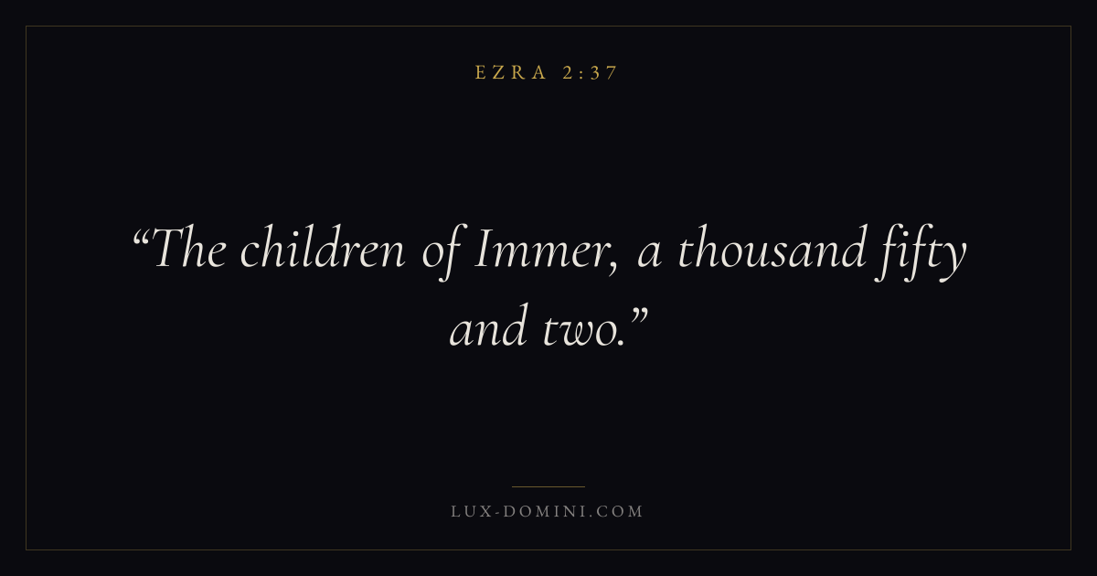 Books / Ezra / Chapter 2 / Verse 37 ← Ezra 2:36 Ezra 2:37 Ezra 2:38 → The children of Immer, a thousand fifty and two. Download verse card Share on Twitter Share on Facebook Pin it ✦ Key themes ReturnTempleTorahRepentance Read with Ezra 2:36Ezra 2:38 Related topics Bible verses about repentance ✦ Ezra Chapter 2 verses V. 1 V. 2 V. 3 V. 4 V. 5 V. 6 V. 7 V. 8 V. 9 V. 10 V. 11 V. 12 V. 13 V. 14 V. 15 V. 16 V. 17 V. 18 V. 19 V. 20 V. 21 V. 22 V. 23 V. 24 V. 25 V. 26 V. 27 V. 28 V. 29 V. 30 V. 31 V. 32 V. 33 V. 34 V. 35 V. 36 V. 37 V. 38 V. 39 V. 40 V. 41 V. 42 V. 43 V. 44 V. 45 V. 46 V. 47 V. 48 V. 49 V. 50 V. 51 V. 52 V. 53 V. 54 V. 55 V. 56 V. 57 V. 58 V. 59 V. 60 V. 61 V. 62 V. 63 V. 64 V. 65 V. 66 V. 67 V. 68 V. 69 V. 70
