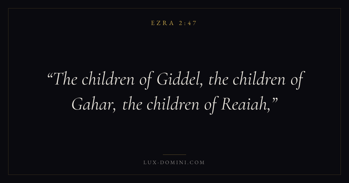 Books / Ezra / Chapter 2 / Verse 47 ← Ezra 2:46 Ezra 2:47 Ezra 2:48 → The children of Giddel, the children of Gahar, the children of Reaiah, Download verse card Share on Twitter Share on Facebook Pin it ✦ Key themes ReturnTempleTorahRepentance Read with Ezra 2:43Ezra 2:44 Related topics Bible verses about repentance ✦ Ezra Chapter 2 verses V. 1 V. 2 V. 3 V. 4 V. 5 V. 6 V. 7 V. 8 V. 9 V. 10 V. 11 V. 12 V. 13 V. 14 V. 15 V. 16 V. 17 V. 18 V. 19 V. 20 V. 21 V. 22 V. 23 V. 24 V. 25 V. 26 V. 27 V. 28 V. 29 V. 30 V. 31 V. 32 V. 33 V. 34 V. 35 V. 36 V. 37 V. 38 V. 39 V. 40 V. 41 V. 42 V. 43 V. 44 V. 45 V. 46 V. 47 V. 48 V. 49 V. 50 V. 51 V. 52 V. 53 V. 54 V. 55 V. 56 V. 57 V. 58 V. 59 V. 60 V. 61 V. 62 V. 63 V. 64 V. 65 V. 66 V. 67 V. 68 V. 69 V. 70