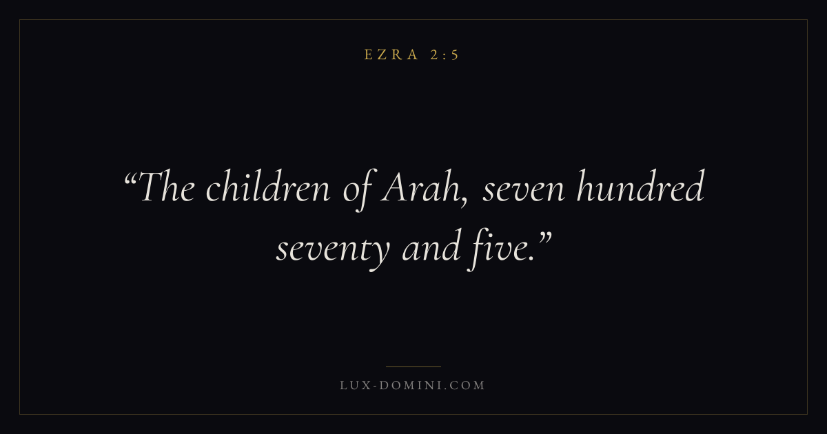 Books / Ezra / Chapter 2 / Verse 5 ← Ezra 2:4 Ezra 2:5 Ezra 2:6 → The children of Arah, seven hundred seventy and five. Download verse card Share on Twitter Share on Facebook Pin it ✦ Key themes ReturnTempleTorahRepentance Read with Ezra 2:4 Related topics Bible verses about repentance ✦ Ezra Chapter 2 verses V. 1 V. 2 V. 3 V. 4 V. 5 V. 6 V. 7 V. 8 V. 9 V. 10 V. 11 V. 12 V. 13 V. 14 V. 15 V. 16 V. 17 V. 18 V. 19 V. 20 V. 21 V. 22 V. 23 V. 24 V. 25 V. 26 V. 27 V. 28 V. 29 V. 30 V. 31 V. 32 V. 33 V. 34 V. 35 V. 36 V. 37 V. 38 V. 39 V. 40 V. 41 V. 42 V. 43 V. 44 V. 45 V. 46 V. 47 V. 48 V. 49 V. 50 V. 51 V. 52 V. 53 V. 54 V. 55 V. 56 V. 57 V. 58 V. 59 V. 60 V. 61 V. 62 V. 63 V. 64 V. 65 V. 66 V. 67 V. 68 V. 69 V. 70