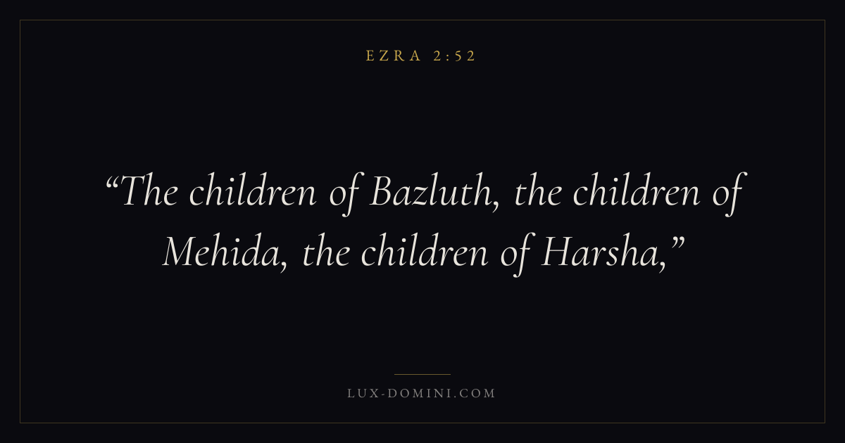Books / Ezra / Chapter 2 / Verse 52 ← Ezra 2:51 Ezra 2:52 Ezra 2:53 → The children of Bazluth, the children of Mehida, the children of Harsha, Download verse card Share on Twitter Share on Facebook Pin it ✦ Key themes ReturnTempleTorahRepentance Read with Ezra 2:48Ezra 2:49 Related topics Bible verses about repentance ✦ Ezra Chapter 2 verses V. 1 V. 2 V. 3 V. 4 V. 5 V. 6 V. 7 V. 8 V. 9 V. 10 V. 11 V. 12 V. 13 V. 14 V. 15 V. 16 V. 17 V. 18 V. 19 V. 20 V. 21 V. 22 V. 23 V. 24 V. 25 V. 26 V. 27 V. 28 V. 29 V. 30 V. 31 V. 32 V. 33 V. 34 V. 35 V. 36 V. 37 V. 38 V. 39 V. 40 V. 41 V. 42 V. 43 V. 44 V. 45 V. 46 V. 47 V. 48 V. 49 V. 50 V. 51 V. 52 V. 53 V. 54 V. 55 V. 56 V. 57 V. 58 V. 59 V. 60 V. 61 V. 62 V. 63 V. 64 V. 65 V. 66 V. 67 V. 68 V. 69 V. 70
