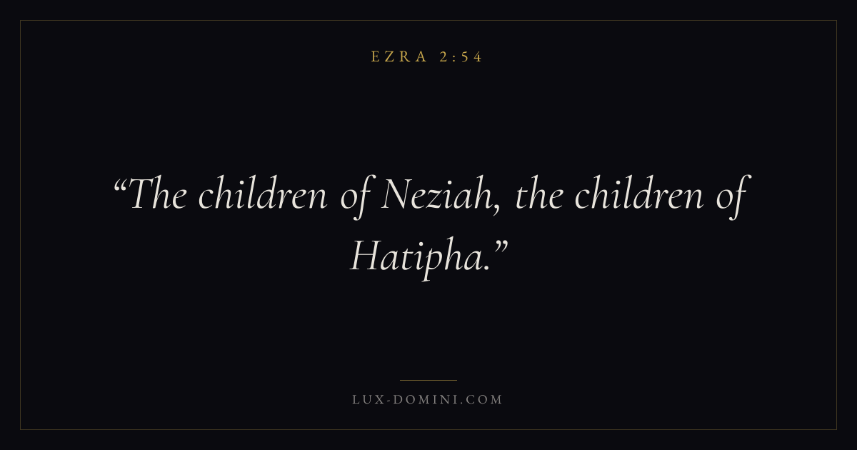 Books / Ezra / Chapter 2 / Verse 54 ← Ezra 2:53 Ezra 2:54 Ezra 2:55 → The children of Neziah, the children of Hatipha. Download verse card Share on Twitter Share on Facebook Pin it ✦ Key themes ReturnTempleTorahRepentance Read with Ezra 2:53 Related topics Bible verses about repentance ✦ Ezra Chapter 2 verses V. 1 V. 2 V. 3 V. 4 V. 5 V. 6 V. 7 V. 8 V. 9 V. 10 V. 11 V. 12 V. 13 V. 14 V. 15 V. 16 V. 17 V. 18 V. 19 V. 20 V. 21 V. 22 V. 23 V. 24 V. 25 V. 26 V. 27 V. 28 V. 29 V. 30 V. 31 V. 32 V. 33 V. 34 V. 35 V. 36 V. 37 V. 38 V. 39 V. 40 V. 41 V. 42 V. 43 V. 44 V. 45 V. 46 V. 47 V. 48 V. 49 V. 50 V. 51 V. 52 V. 53 V. 54 V. 55 V. 56 V. 57 V. 58 V. 59 V. 60 V. 61 V. 62 V. 63 V. 64 V. 65 V. 66 V. 67 V. 68 V. 69 V. 70
