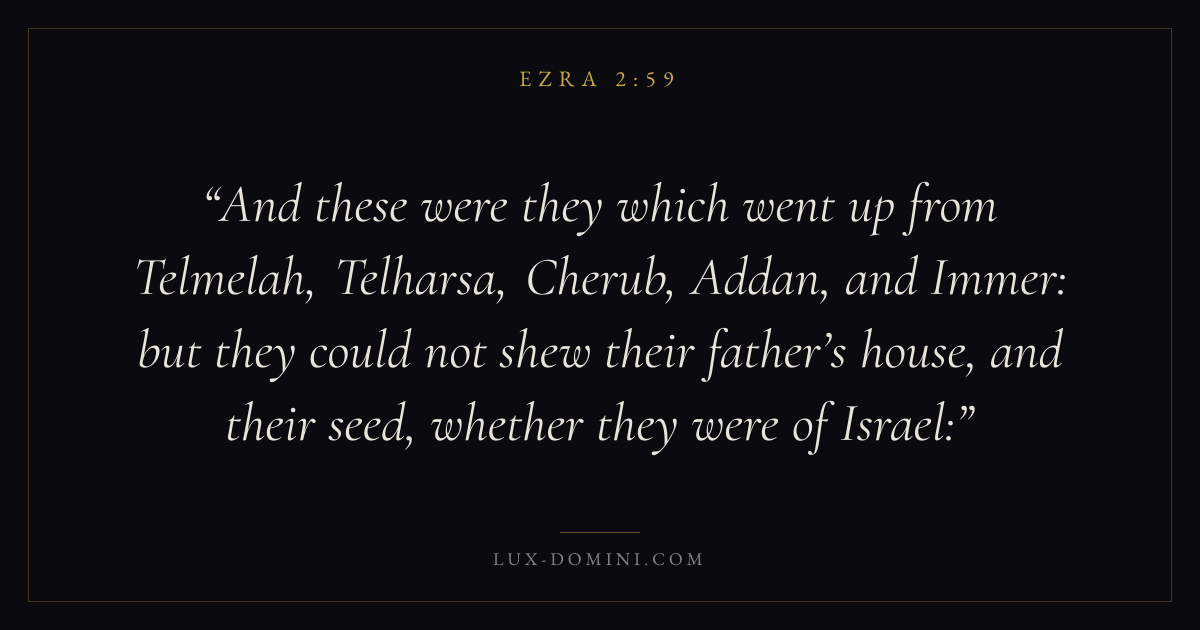 And these were they which went up from Telmelah, Telharsa, Cherub, Addan, and Immer: but they could not shew their father’s house, and their seed, whether they were of Israel: