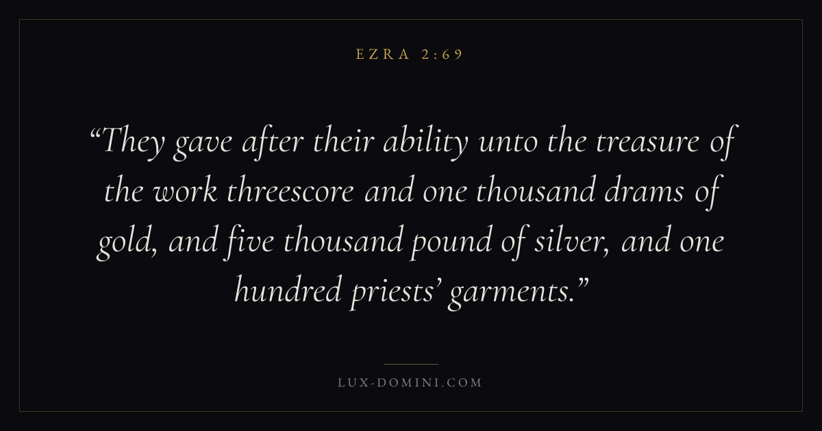 They gave after their ability unto the treasure of the work threescore and one thousand drams of gold, and five thousand pound of silver, and one hundred priests’ garments.