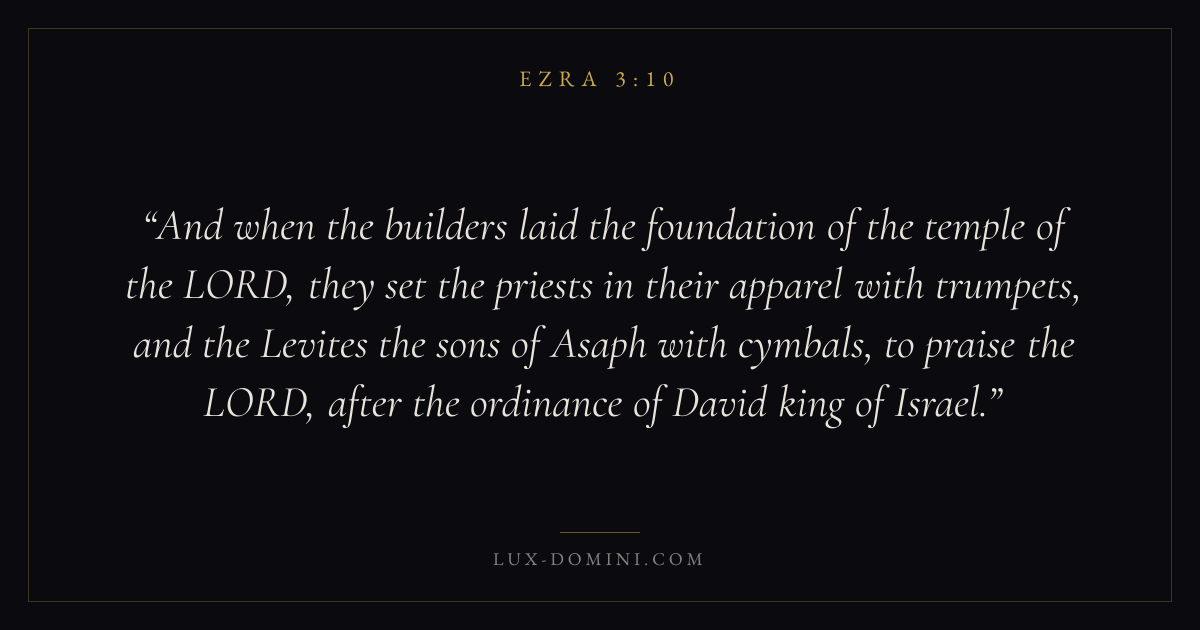 And when the builders laid the foundation of the temple of the LORD, they set the priests in their apparel with trumpets, and the Levites the sons of Asaph with cymbals, to praise the LORD, after the ordinance of David king of Israel.