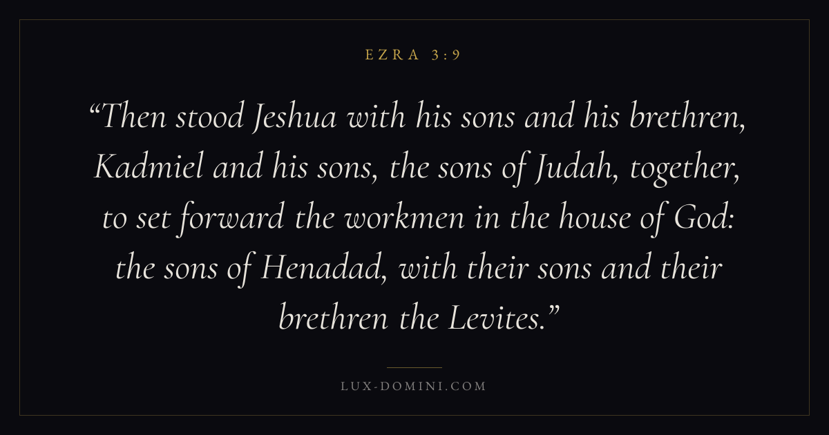 Then stood Jeshua with his sons and his brethren, Kadmiel and his sons, the sons of Judah, together, to set forward the workmen in the house of God: the sons of Henadad, with their sons and their brethren the Levites.