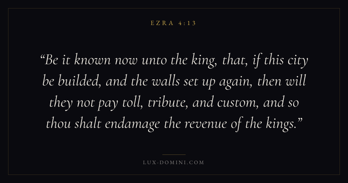 Be it known now unto the king, that, if this city be builded, and the walls set up again, then will they not pay toll, tribute, and custom, and so thou shalt endamage the revenue of the kings.