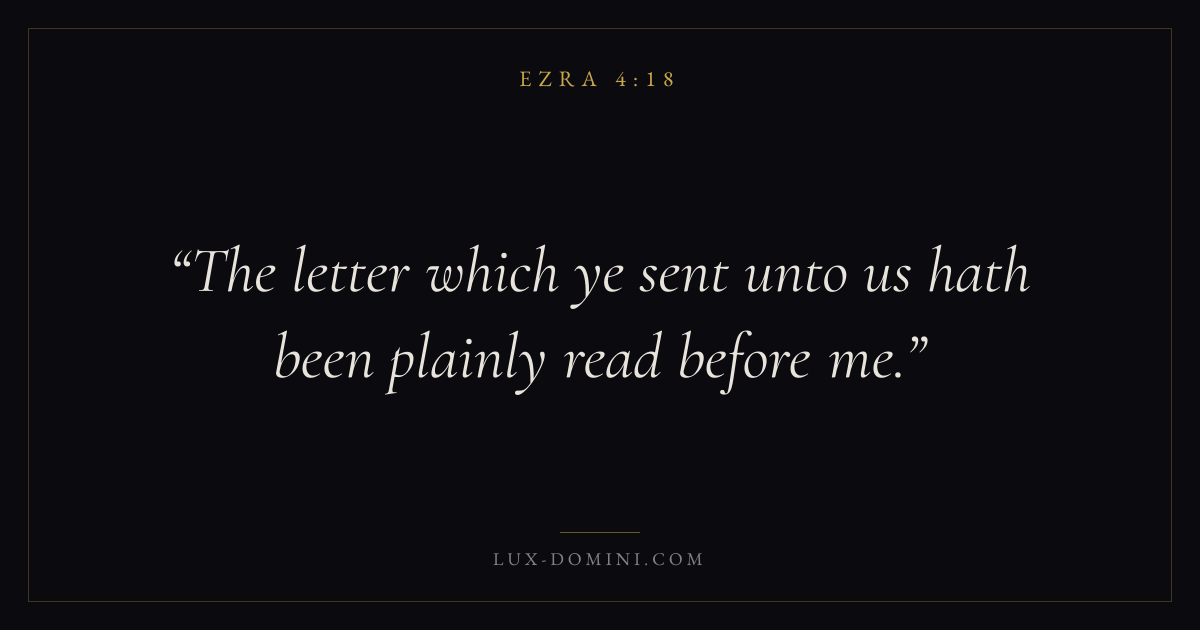 Books / Ezra / Chapter 4 / Verse 18 ← Ezra 4:17 Ezra 4:18 Ezra 4:19 → The letter which ye sent unto us hath been plainly read before me. Download verse card Share on Twitter Share on Facebook Pin it ✦ Key themes TruthReturnTempleTorah Read with Ezra 4:17Ezra 4:19John 14:6John 8:32 Related topics Bible verses about truth ✦ Ezra Chapter 4 verses V. 1 V. 2 V. 3 V. 4 V. 5 V. 6 V. 7 V. 8 V. 9 V. 10 V. 11 V. 12 V. 13 V. 14 V. 15 V. 16 V. 17 V. 18 V. 19 V. 20 V. 21 V. 22 V. 23 V. 24