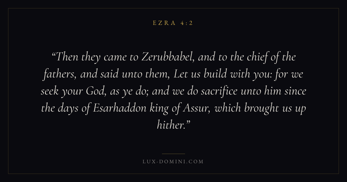 Then they came to Zerubbabel, and to the chief of the fathers, and said unto them, Let us build with you: for we seek your God, as ye do; and we do sacrifice unto him since the days of Esarhaddon king of Assur, which brought us up hither.