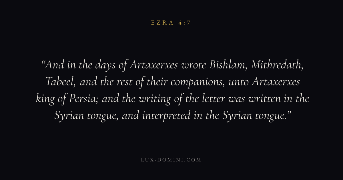 And in the days of Artaxerxes wrote Bishlam, Mithredath, Tabeel, and the rest of their companions, unto Artaxerxes king of Persia; and the writing of the letter was written in the Syrian tongue, and interpreted in the Syrian tongue.