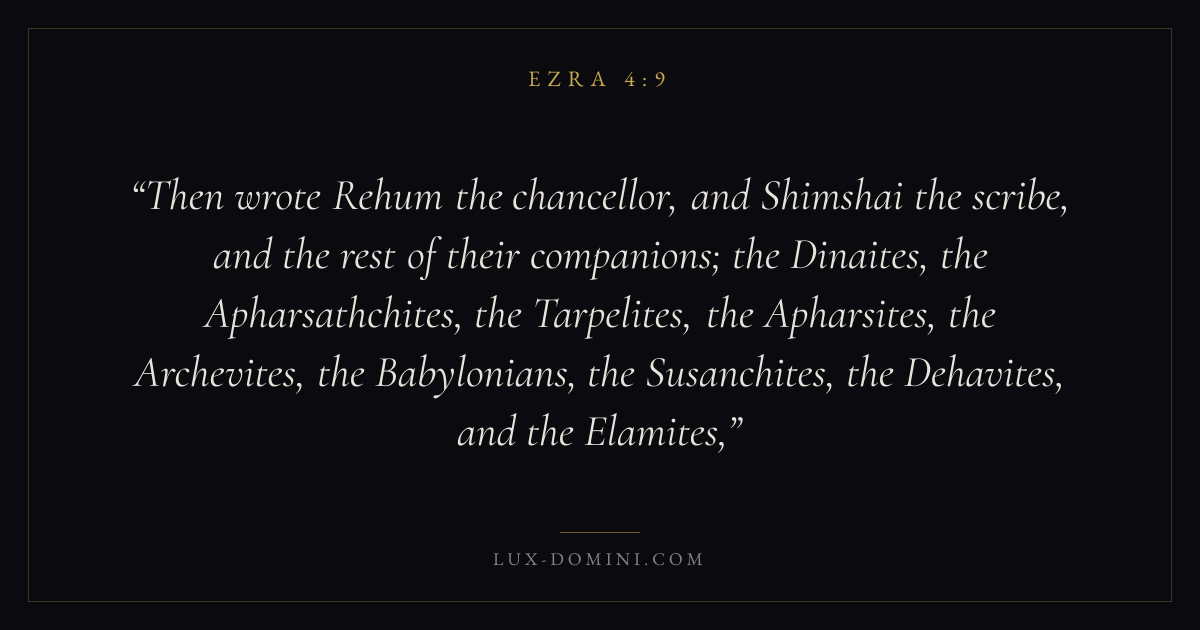 Then wrote Rehum the chancellor, and Shimshai the scribe, and the rest of their companions; the Dinaites, the Apharsathchites, the Tarpelites, the Apharsites, the Archevites, the Babylonians, the Susanchites, the Dehavites, and the Elamites,