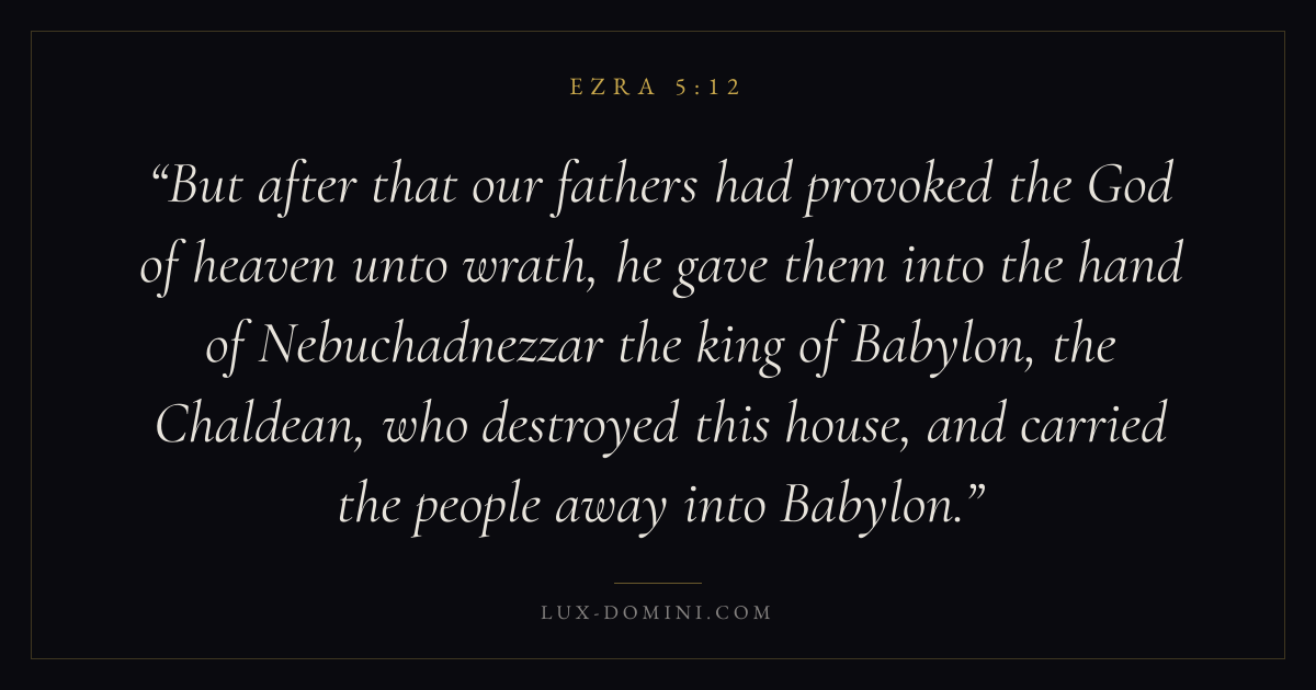 But after that our fathers had provoked the God of heaven unto wrath, he gave them into the hand of Nebuchadnezzar the king of Babylon, the Chaldean, who destroyed this house, and carried the people away into Babylon.
