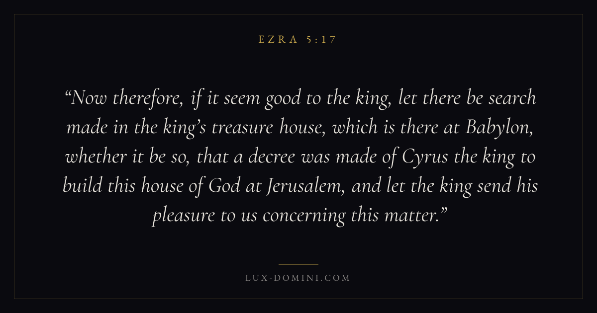 Now therefore, if it seem good to the king, let there be search made in the king’s treasure house, which is there at Babylon, whether it be so, that a decree was made of Cyrus the king to build this house of God at Jerusalem, and let the king send his pleasure to us concerning this matter.