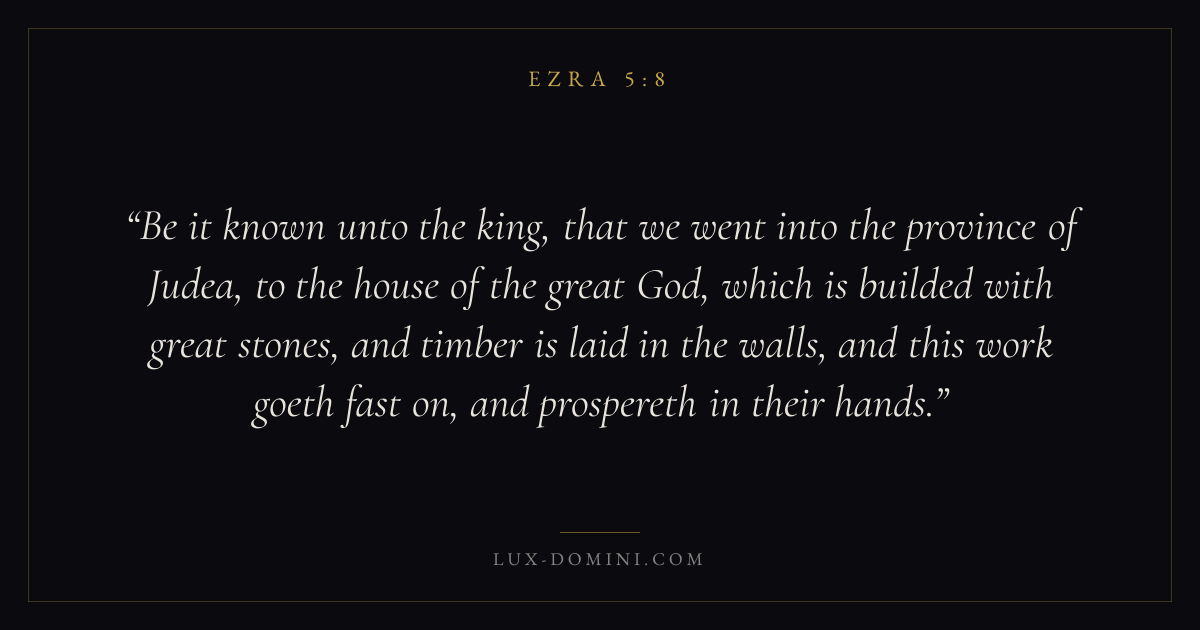 Be it known unto the king, that we went into the province of Judea, to the house of the great God, which is builded with great stones, and timber is laid in the walls, and this work goeth fast on, and prospereth in their hands.
