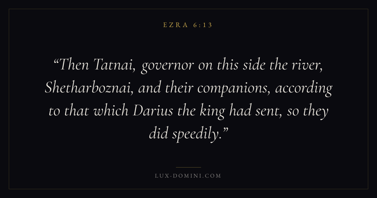 Then Tatnai, governor on this side the river, Shetharboznai, and their companions, according to that which Darius the king had sent, so they did speedily.