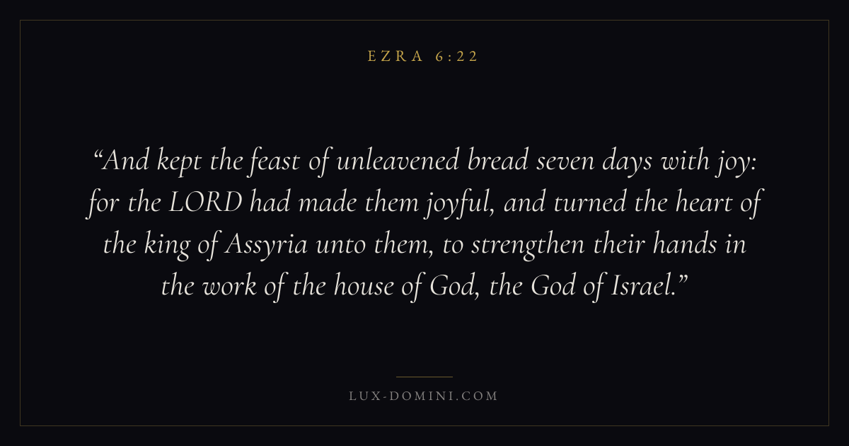 And kept the feast of unleavened bread seven days with joy: for the LORD had made them joyful, and turned the heart of the king of Assyria unto them, to strengthen their hands in the work of the house of God, the God of Israel.