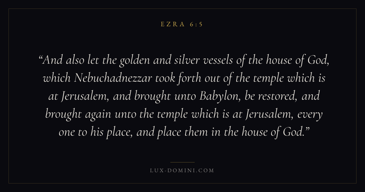 And also let the golden and silver vessels of the house of God, which Nebuchadnezzar took forth out of the temple which is at Jerusalem, and brought unto Babylon, be restored, and brought again unto the temple which is at Jerusalem, every one to his place, and place them in the house of God.