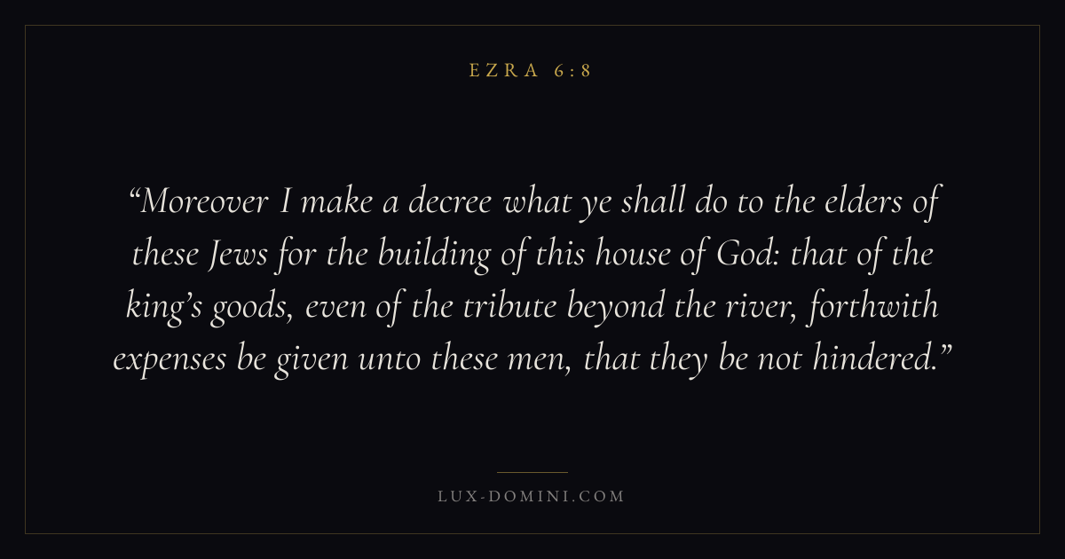 Moreover I make a decree what ye shall do to the elders of these Jews for the building of this house of God: that of the king’s goods, even of the tribute beyond the river, forthwith expenses be given unto these men, that they be not hindered.