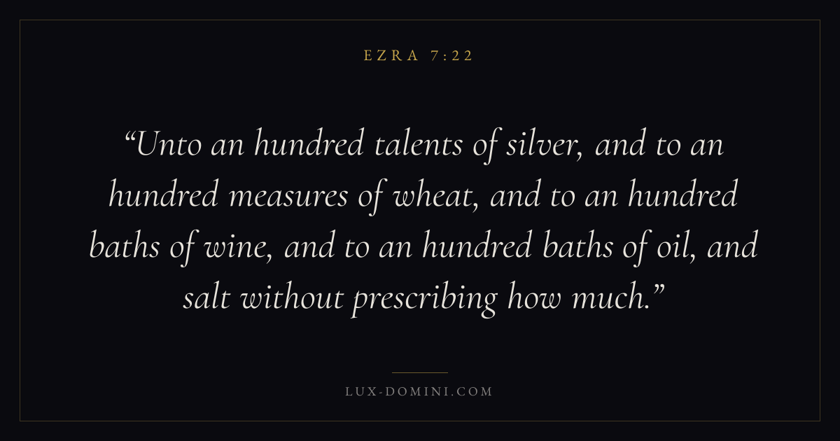 Unto an hundred talents of silver, and to an hundred measures of wheat, and to an hundred baths of wine, and to an hundred baths of oil, and salt without prescribing how much.