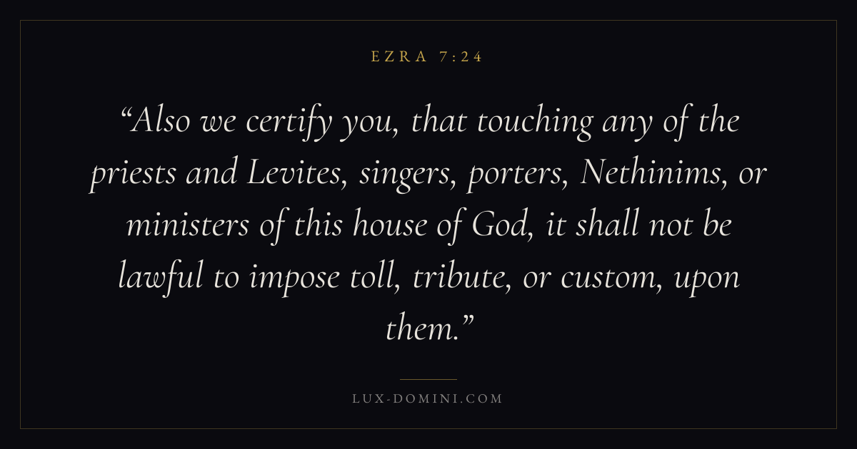 Also we certify you, that touching any of the priests and Levites, singers, porters, Nethinims, or ministers of this house of God, it shall not be lawful to impose toll, tribute, or custom, upon them.