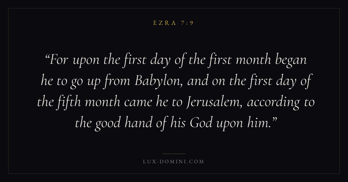 For upon the first day of the first month began he to go up from Babylon, and on the first day of the fifth month came he to Jerusalem, according to the good hand of his God upon him.