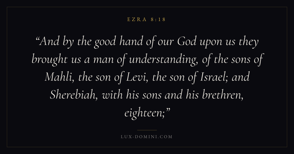 And by the good hand of our God upon us they brought us a man of understanding, of the sons of Mahli, the son of Levi, the son of Israel; and Sherebiah, with his sons and his brethren, eighteen;