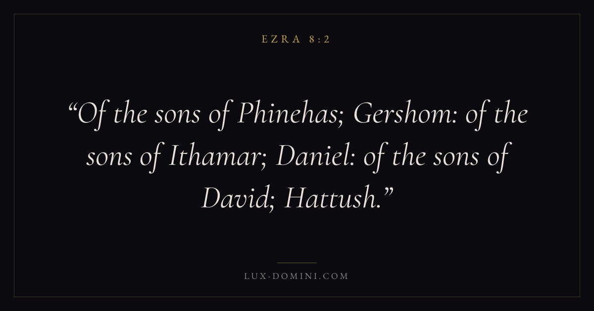 Of the sons of Phinehas; Gershom: of the sons of Ithamar; Daniel: of the sons of David; Hattush.