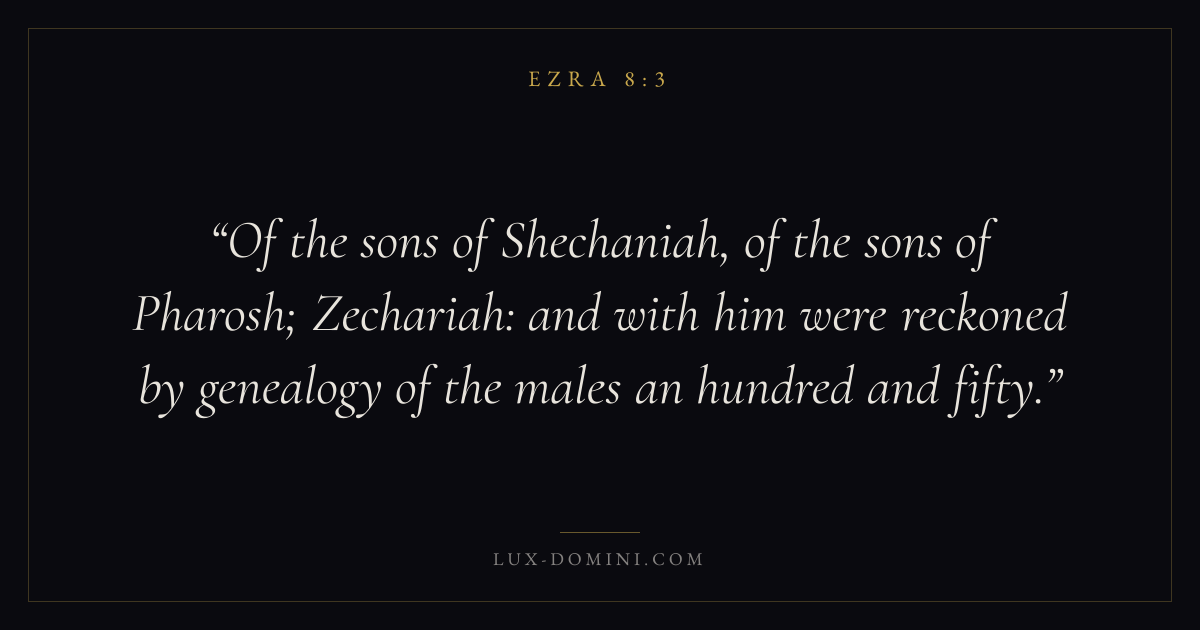 Of the sons of Shechaniah, of the sons of Pharosh; Zechariah: and with him were reckoned by genealogy of the males an hundred and fifty.