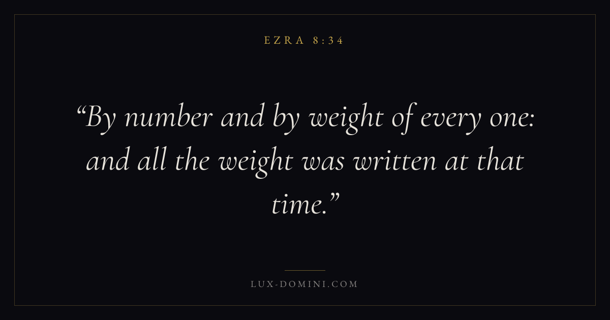 Books / Ezra / Chapter 8 / Verse 34 ← Ezra 8:33 Ezra 8:34 Ezra 8:35 → By number and by weight of every one: and all the weight was written at that time. Download verse card Share on Twitter Share on Facebook Pin it ✦ Key themes HopePrayerReturnTemple Read with Ezra 8:33Ezra 8:35Romans 8:24Revelation 21:4 Related topics Bible verses about hopeBible verses about prayer ✦ Ezra Chapter 8 verses V. 1 V. 2 V. 3 V. 4 V. 5 V. 6 V. 7 V. 8 V. 9 V. 10 V. 11 V. 12 V. 13 V. 14 V. 15 V. 16 V. 17 V. 18 V. 19 V. 20 V. 21 V. 22 V. 23 V. 24 V. 25 V. 26 V. 27 V. 28 V. 29 V. 30 V. 31 V. 32 V. 33 V. 34 V. 35 V. 36