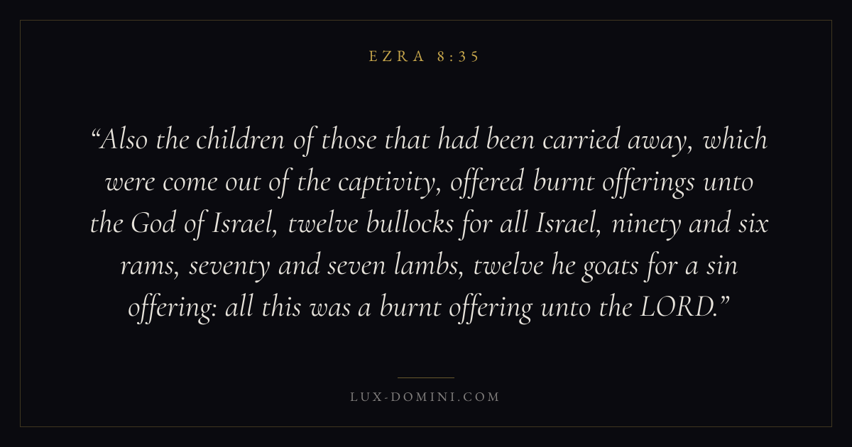 Also the children of those that had been carried away, which were come out of the captivity, offered burnt offerings unto the God of Israel, twelve bullocks for all Israel, ninety and six rams, seventy and seven lambs, twelve he goats for a sin offering: all this was a burnt offering unto the LORD.