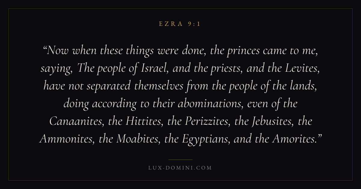 Now when these things were done, the princes came to me, saying, The people of Israel, and the priests, and the Levites, have not separated themselves from the people of the lands, doing according to their abominations, even of the Canaanites, the Hittites, the Perizzites, the Jebusites, the Ammonites, the Moabites, the Egyptians, and the Amorites.