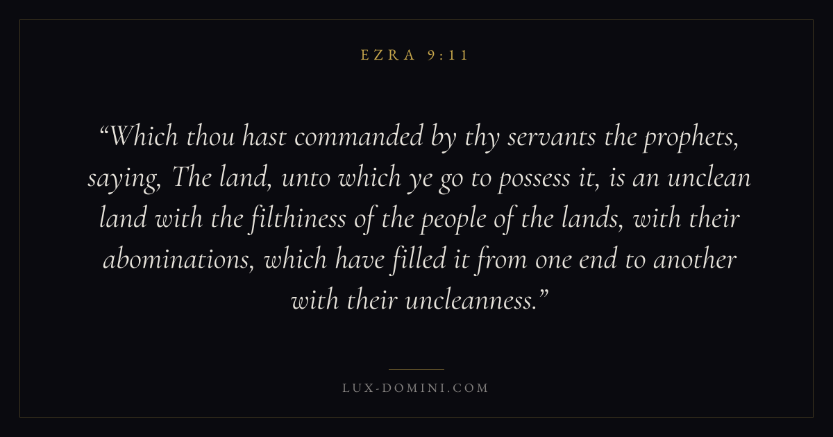 Which thou hast commanded by thy servants the prophets, saying, The land, unto which ye go to possess it, is an unclean land with the filthiness of the people of the lands, with their abominations, which have filled it from one end to another with their uncleanness.
