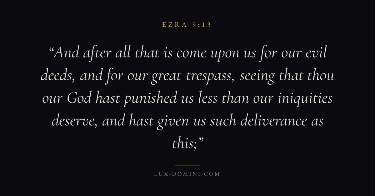 And after all that is come upon us for our evil deeds, and for our great trespass, seeing that thou our God hast punished us less than our iniquities deserve, and hast given us such deliverance as this;