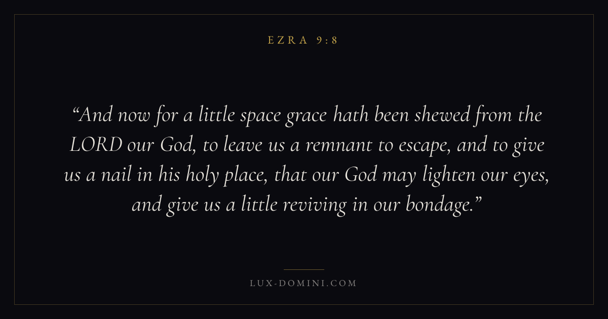 And now for a little space grace hath been shewed from the LORD our God, to leave us a remnant to escape, and to give us a nail in his holy place, that our God may lighten our eyes, and give us a little reviving in our bondage.