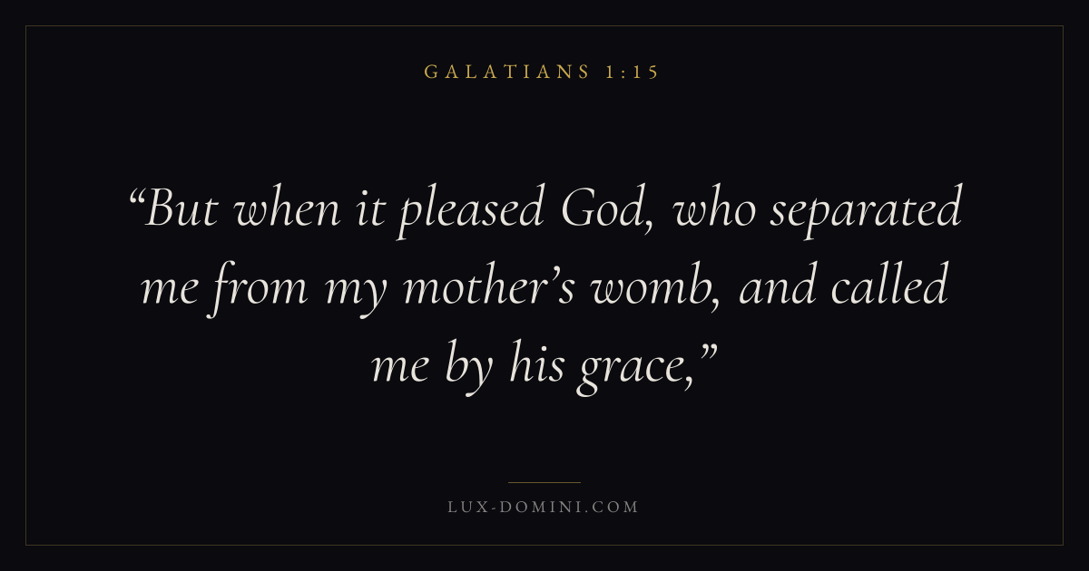 Books / Galatians / Chapter 1 / Verse 15 ← Galatians 1:14 Galatians 1:15 Galatians 1:16 → But when it pleased God, who separated me from my mother’s womb, and called me by his grace, Download verse card Share on Twitter Share on Facebook Pin it ✦ Key themes FaithHopeWisdomGraceJustification Read with Galatians 1:16Galatians 1:17Hebrews 11:1Romans 10:17 Related topics Bible verses about faithBible verses about hopeBible verses about wisdomBible verses about grace ✦ Galatians Chapter 1 verses V. 1 V. 2 V. 3 V. 4 V. 5 V. 6 V. 7 V. 8 V. 9 V. 10 V. 11 V. 12 V. 13 V. 14 V. 15 V. 16 V. 17 V. 18 V. 19 V. 20 V. 21 V. 22 V. 23 V. 24